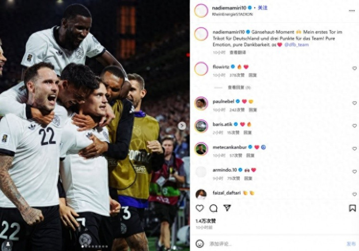 他也在赛后通过社媒晒出全队的庆祝照,并配文:“真是让人鸡皮疙瘩都起来了🙌我身披德国队战袍的首粒进球,为球队赢下了三分!无比激动,无比感恩。”