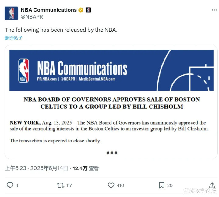 北京时间8月14日,NBA官方宣布:联盟董事会正式批准了凯尔特人的股权转让交易。奇泽姆率领的财团以61亿美元的估值收购凯尔特人,这笔交易分成两步进行:今年夏天先购买凯尔特人51%的股份,剩余部分将在2028年完成。