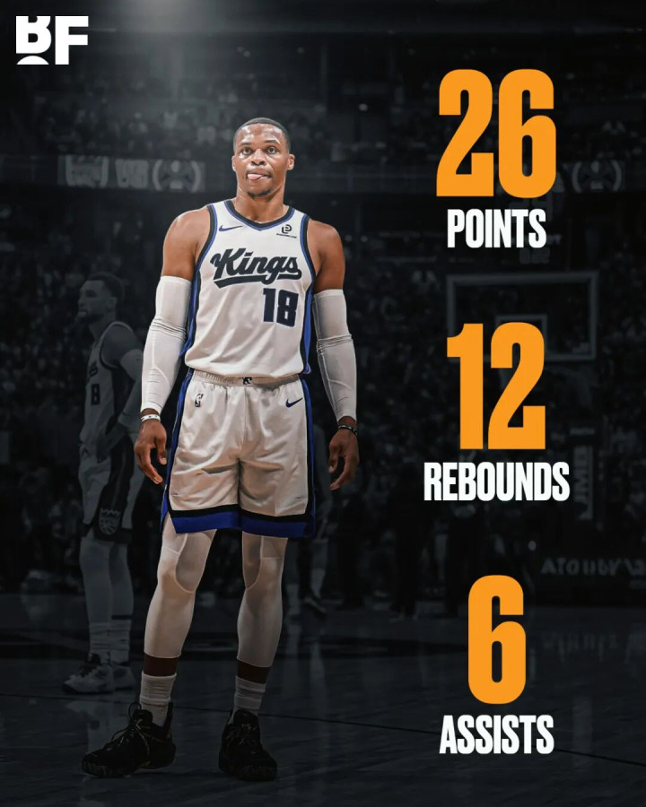 截至目前,威少全勤打了国王的7场比赛,场均可以拿到13.9分5.9篮板5.0助攻1.4抢断,三项命中率分别是43.2%/39.4%/70.0%。