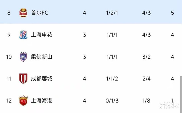 4轮结束后,作为中超的领头羊,上海海港1平3负,稳居积分榜的最后一位。而成都蓉城也跌出了前八。倘若晚些时候,上海申花面对柔佛新山出现闪失,那么中超BIG3将会出现集体掉出晋级区,甚至会出现3支球队稳居积分榜后三位的“奇观”。