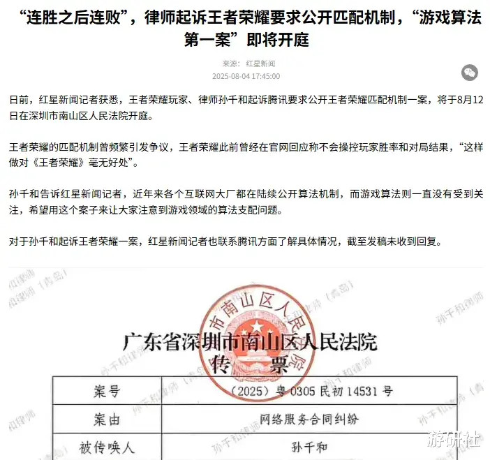 前些天,一起“律师玩家诉《王者荣耀》匹配机制案”,宣告即将于8月12日在深圳市南山区人民法院进行开庭审理。
