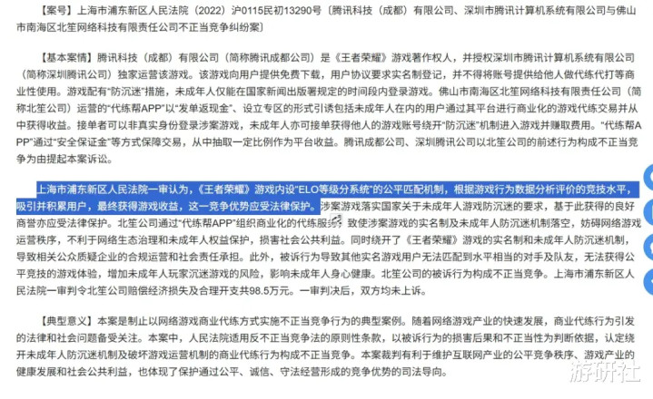 2022年,上海浦东新区法院就有一起涉及《王者荣耀》代练的不正当竞争案,明确认定匹配算法属于可保护的竞争优势,代练行为破坏该机制构成侵权。