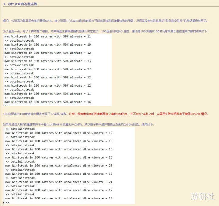 大概四五年前的时候,我在NGA的DOTA2板块见过一次持续数个月的“V社到底有没有控制50%胜率”讨论,那时有位玩家(@WaterEast)跑了个模型,从数学角度论证了一下“为什么连胜之后接连败(以及连败之后接连胜)都是正常的数学现象”。