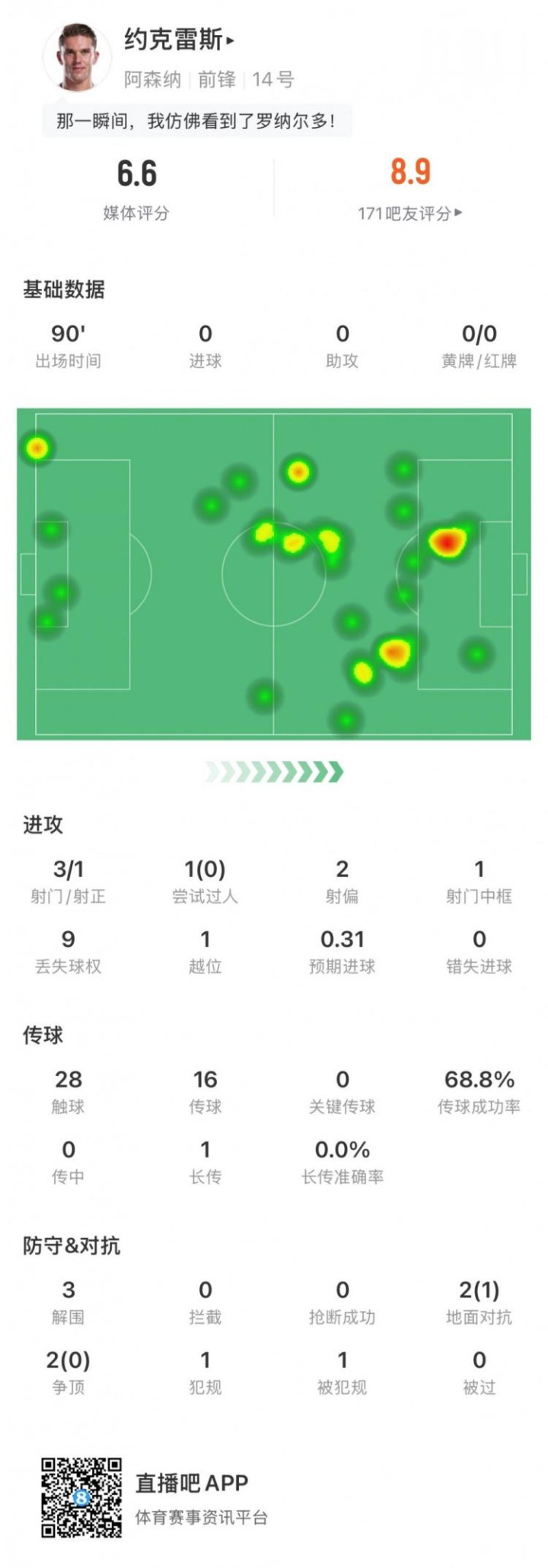 本场比赛约克雷斯为枪手首发踢满全场,出任球队的进攻桥头堡,同时还积极参与防守,赛后他获得了6.6分的全场评分。