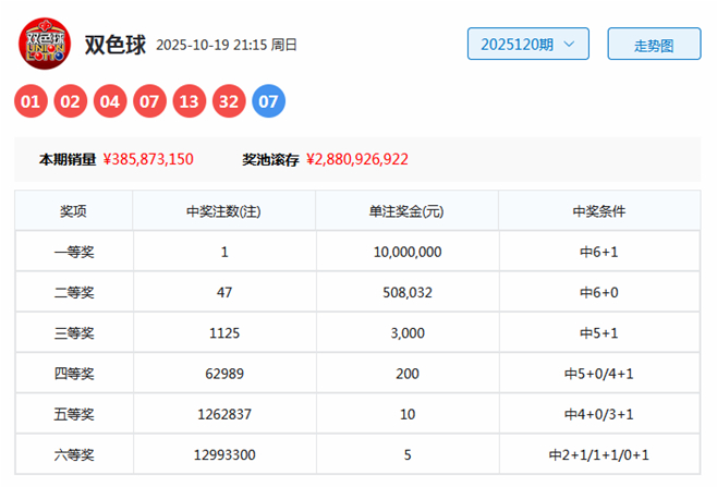 开奖回顾:双色球第2025120期奖号为:01 02 04 07 13 32 + 07,其中红球号码奇偶比为3:3,大小比为1:5,012路比为0:4:2,三区比为4:1:1。