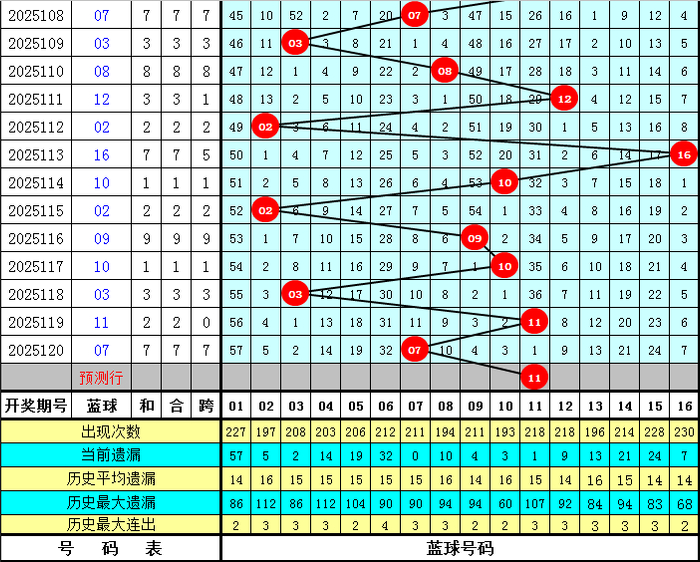 蓝球分析:最近7期蓝球号码012路比为2:3:2,奇偶比为4:3,大小比为4:3,本期重点关注大号蓝球出现,独蓝参考11。