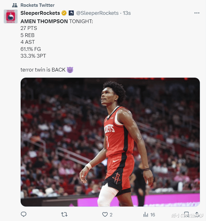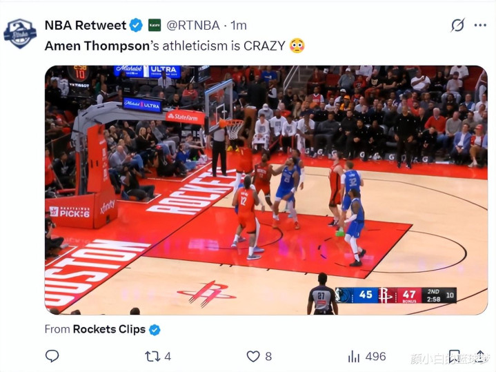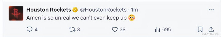 火箭官方:阿门这太不真实了,我甚至跟不上他。(半场打完阿门已经20分4篮板4助攻1抢断,火箭得分最高的)