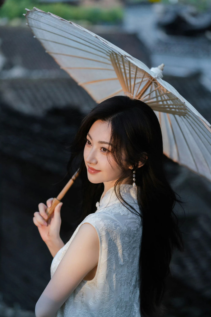 就像她最近在《灼灼风流》里的沈惊鸿:出身世家却不囿于闺阁,温柔里带着书卷气的韧。而这组写真里的她,把角色里的「闺秀感」剥去了戏服的厚重,只留最本真的南方气韵:撑伞时指尖轻蜷的弧度,执扇时眼尾垂落的软意,连耳坠上的珍珠都像晨露,顺着鬓发淌进了黛瓦的阴影里。