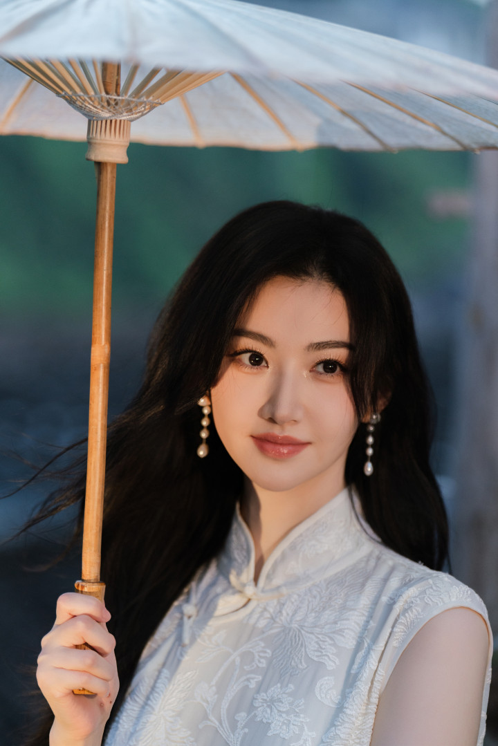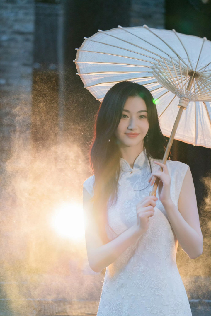 是撑伞时眼尾弯起的弧度,像江南的月;是执扇时唇瓣轻扬的笑意,像雨打芭蕉的软。没有尖锐的美,只有「润如温玉」的舒展——像书香门第里养出的姑娘,读过书、见过世面,却把锋芒藏进了温柔里。