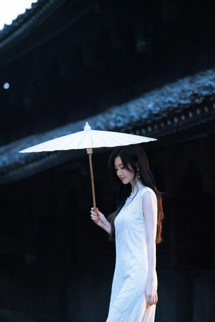 江南建筑的底色是「淡」:青灰的瓦、斑驳的墙,像被雨水洗过的砚台,而景甜像一滴落在宣纸上的墨——不浓烈,却把温柔晕得满溢。她站在檐下时,油纸伞的竹骨和建筑的木梁纹路相叠,旗袍的素白和墙面的灰调相融,连光都变得软绵:夕阳裹着雾霭落在她发梢,像旧书里夹着的银杏叶,藏着「岁月不惊」的安稳。