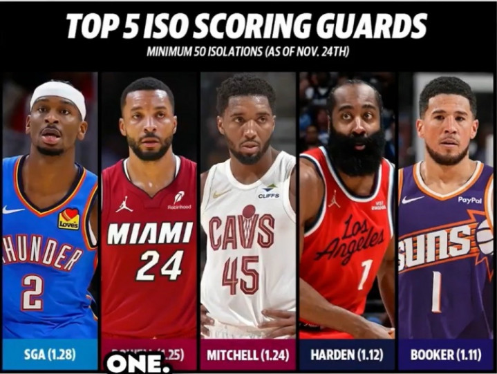 五人分别是:1、亚历山大(每个单打回合得分1.28分);2、鲍威尔1.25分;3、米切尔1.24分;4、哈登1.12分;5、布克1.11分。
