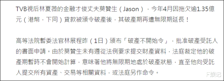 最近有港媒报道林夏薇的老公欠债1.3亿港元,然后债主向法院申请了要其老公破产。而莫赞生本人和律师都没有出庭,拒绝提交财产相关资料,所以法官决定判其破产期无限延长。这就意味本来4年的破产期,目前还没有正式算开始时间,一直等到莫赞生主动提交财产资料、流水证明等。
